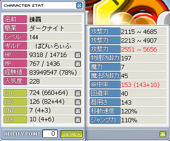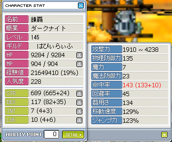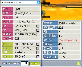 命中165を保ちながら移動速度130、ジャンプ力120にすることができませんでした・・・