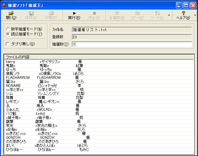 抽選にはフリーソフト「抽選王」を使いました。